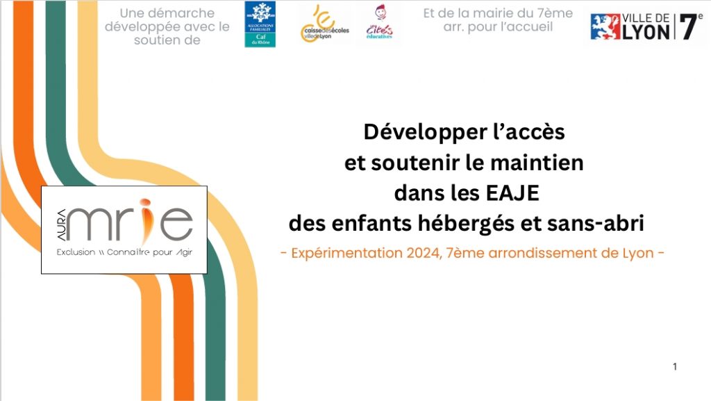 Partant de plusieurs travaux menés dans les années précédentes par la MRIE et du mémoire DEIS de Leslie Tesema, cette expérimentation vise à identifier dans le 7ème arrondissement de Lyon les conditions favorisant l’accueil régulier des enfants hébergés et sans-abri et à outiller les acteurs des structures d’hébergement et les professionnels des EAJE en fonction de ces besoins.